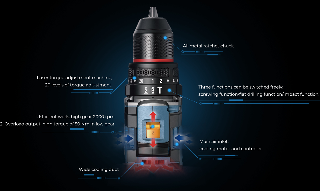 موتور پرسرعت بدون برس گرمای کمتری تولید می کند و برای استفاده مداوم طولانی مدت مناسب تر است. قدرت 20 درصد و گشتاور 30 درصد در همان حجم افزایش می یابد. اتلاف کم، اتلاف گرما خوب است و به راحتی مغناطیس زدایی نمی شود. در شرایط کاری یکسان، عمر موتور 3 برابر افزایش می یابد. ، راندمان موتور بالا و عمر باتری تک پک 20 درصد افزایش یافته است.